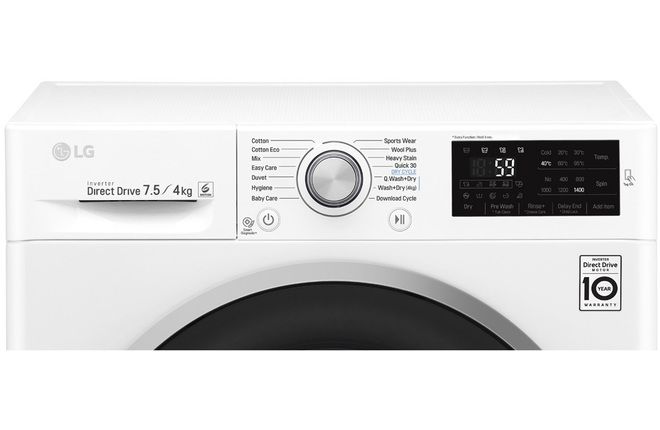 1400rpm 14 Washing Programs with 6 Options¹ Compatible smartphone required, Android 4.1.2 (JellyBean) or later or iOS 8 or later required for LG Smart Laundry app and Audible Smart Diagnosis feature.² Mobile 3G/4G or Wi-Fi connection, LG Smart Laundry app is required for Tag On feature.Washing Machine Type - Washing Machine / Dryer Appliance Colour - White Capacity (kg) - 7.5 Litres Per Wash - 77.0 Spin Speed (RPM) - 1400 Control - Electronic Energy Use (p.a.) - 375 Water Star Rating - 4.0 Energy Star Rating - 3.5 Product Height (mm) - 850.0 Product Width (mm) - 600.0 Product Depth (mm) - 610.0 Product Weight (kg) - 62.0 Packaged Height (mm) - 885.0 Packaged Width (mm) - 655.0 Packaged Depth (mm) - 660.0 Packaged Weight (kg) - 66.0