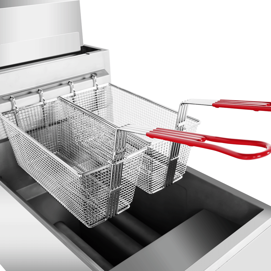Food particles fall below burner tubes into a cold zone which increases oil life