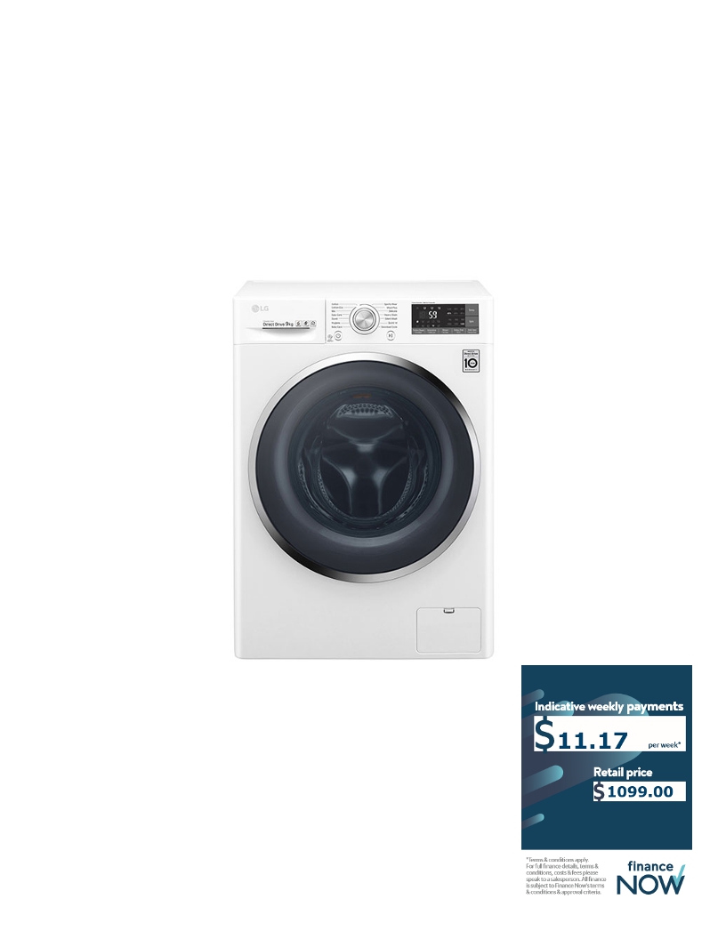 GENERAL INFO Model: WD1409NPW Condition: Refurbished - warranty return whatever the issue was has been rectified (please ask for pictures). (Samsung and LG stock have serial numbers removed as per our contracts with these suppliers.) Warranty: 1 year - add 4 more years of care for: $159. SRRP ($): 1899 SPECIFICATIONS Capacity (KG): 9 Washing program(s): 14 (Cotton; Cotton Eco; Easy Care; Mix; Hygiene; Duvet; Sports Wear; Baby Care; Silent Wash; Delicate; Quick 14; Wool Plus; Heavy Stain; Download Cycle (Default Rinse+Spin)) Spin speed (RPM): 1400 Energy rating: 4 stars - 345kWh per annum (warm wash) Water rating: 4.5 stars - 77L per wash Interface: Electronic push-button and dial w/LED display Inlet(s): Hot and cold (hoses supplied) Dimensions (mm): 610d x 600w x 850h FEATURES • 6 Motion Wash Technology • Turbo Clean® (a nozzle hastens the delivery of water to the washing-machine, reducing cycle time) • Delayed start timer • "Add A Garment" feature (this allows you to add or remove clothes from the washing-machine during a wash cycle) • Inverter direct drive motor • SmartThinQ® compatible (this allows users to operate their washing-machine remotely) • Smart™ Diagnosis (this allows compatible devices, like smartphones, to assist you in diagnosing any problems with your washing-machine) • Child lock *Afterpay, genoapay and Finance available. We also accept: FinanceNow, GemVisa/GE Credit, Qcard, and Farmers card.*